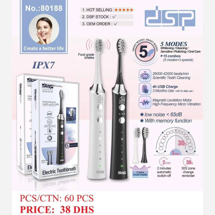 مسواک شارژی در دو رنگ رندوم 5 حالت حساس/براقکننده/مراقبت از دهان 15 ترکیب (5 حالت × 3 سرعت) SPE مدل: 80188 سلامت لثه را تا 100٪ بهبود میبخشد IPX7 مسواک برقی سفیدکننده/تمیزکننده 26000-42000 ضربه در دقیقه، تمیزکننده علمی دندان 4 ساعت شارژ usb،3 ماه استفاده (با 2 بار استفاده روزانه) موتور شناور مغناطیسی، میکرو ویبره فرکانس بالا صدای کم < 65 دسیبل با عملکرد حافظه خاموش شدن خودکار 2 دقیقهای یادآوری تغییر منطقه 30 ثانیه 2 سر برس