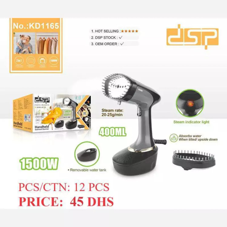دستگاه: اتو بخارگر برند: دی اس پی DSP مدل: KD-1079 حداکثر توان: مصرفی 1400 وات بازه طول کابل: 1 تا 2 متر جنس کفه: فلز ظرفیت مخزن آب 220 میلی لیتر