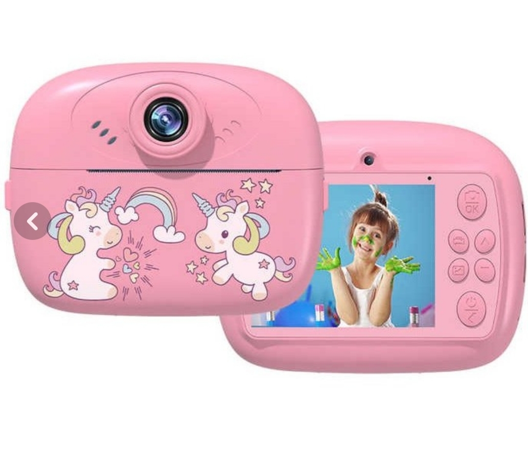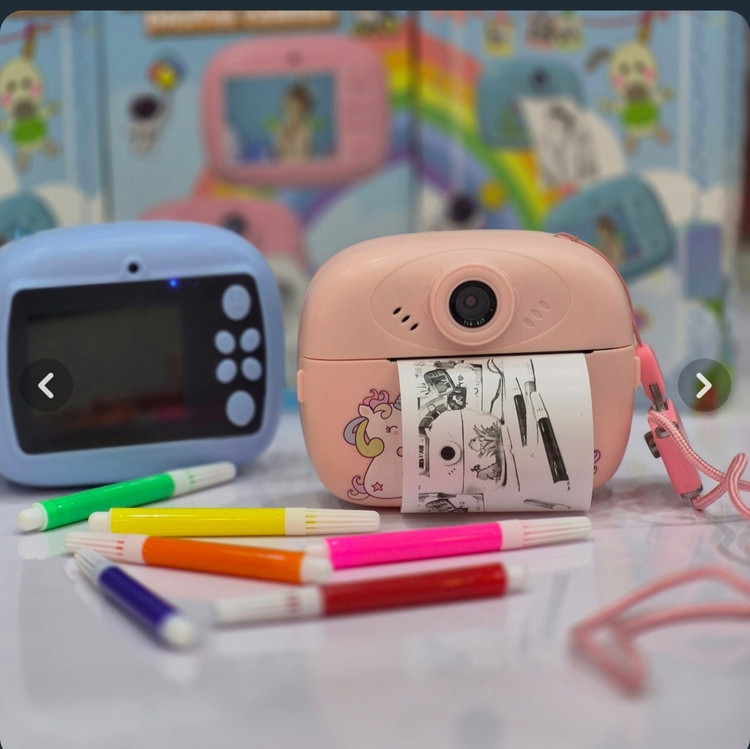 دوربین چاپ فوری سیاه و سفید دو رنگ صورتی و آبی طرح برچسب روی دوربین رندوم می باشد